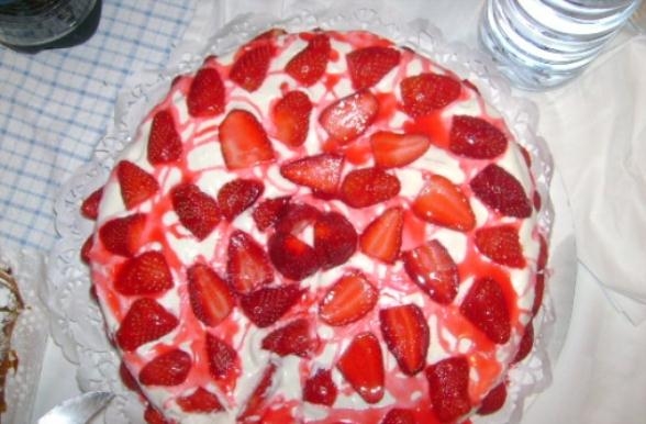 Numa taça junte o iogurte e as gemas, vai mexendo e juntando o açúcar, a farinha, o oleo e por ultimo as claras em castelo. Mexa bem. Unte a forma com margarina e farinha e leve ao lume a 180ºc cerca de 30 a 40 minutos. Depois de arrefecido corte o bolo ao meio no sentido de comprimento de forma a obter 2 partes, coloque uma camada fina de natas e sobreponha a outra parte de bolo . Decore com as restantes natas e morangos. Deve servir-se fresquinho.