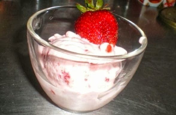Cortar os morangos e deixar 30 minutos com açucar. Bater as natas até ficarem fofas e juntar um pouco de açucar, desfazer os morangos com um garfo e juntar o sumo de limão, juntar as natas e provar (se necessário juntar mais açucar). Depois vai ao congelador. Observação: Pode substituir os morangos por framboesas ou frutos silvestres (caso compre congelado deixar descongelar antes de juntar ao açucar).
