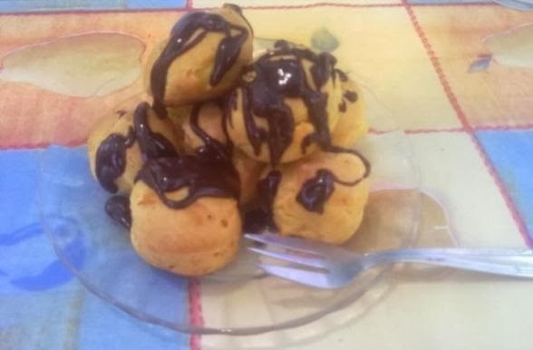 PARA O RECHEIO: Pôr o leite a aquecer e juntar um pouco de essência de baunilha. Misturar as gemas com o açúcar numa tigela, mexendo sempre. Acrescentar as colheres de sopa de farinha pouco a pouco, sem deixar criar grumos. Juntar o leite quente em fio e levar novamente ao lume muito baixo, sem parar de mexer. Quando o creme ficar espesso, retirar do lume e deixar arrefecer. Rechear cada profiterole de creme com a ajudar de um saco ou seringa de pasteleiro. Verter chocolate derretido por cima dos profiteroles e BOM APETITE!!!