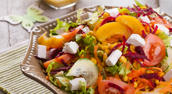 Descasque a cebola e pique-a muito fina. Deite-a para uma tigela, junte a mostarda e o vinagre e misture. Verta o azeite em fio mexendo sempre. Tempere de sal e pimenta, mexa e reserve. Limpe a alface e lave as folhas, corte-as em tiras finas, torne a lavar e deixe escorrer bem. Lave o tomate e corte-o em gomos. Lave o pepino, retire alguma casca e corte-o em rodelas finas. Escorra os pêssegos e o milho, corte os pêssegos em gomos e o queijo em cubos. Na saladeira misture a alface com os pêssegos, o milho e a cenoura. Junte o tomate, o pepino, o queijo e a beterraba.