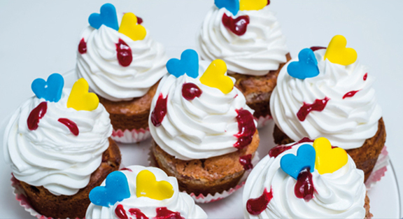 Bata as natas com o açúcar até ficarem espessas. Deite para um saco de pasteleiro com boquilha frisada e coloque uma pequena porção em cima dos queques. Deixe cair alguns pingos de compota em cima das natas e sirva decorado a gosto.