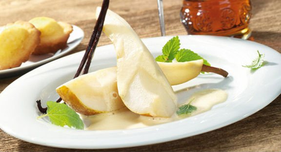 Abrir os pauzinhos de baunilha e raspar o interior. Lavar as peras, cortá-las em quartos, descaroçá-las e regar com o sumo de limão. Cozer as peras com o pau de baunilha e o seu interior, bem como açúcar e o licor, em lume médio durante 20-25 min. (Cuidado para que as peras não se desfaçam). Retirar o tacho do lume e deixar arrefecer. Para preparar o creme de Brandy, juntar as gemas de ovo e o leite ao brandy e mexer com 50 g de açúcar. Cozer em banho-maria quente durante 5-6 minutos, batendo com uma batedeira, até ficar em creme. No último minuto, juntar o brandy. Regar as peras com o creme de Brandy ainda quente e servir. Servir com Madalenas.