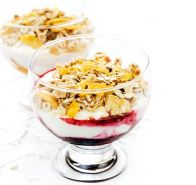 2. Para servir, divida a mistura por 2 copos, seguido de uma camada de iogurte e finalize com o muesli.